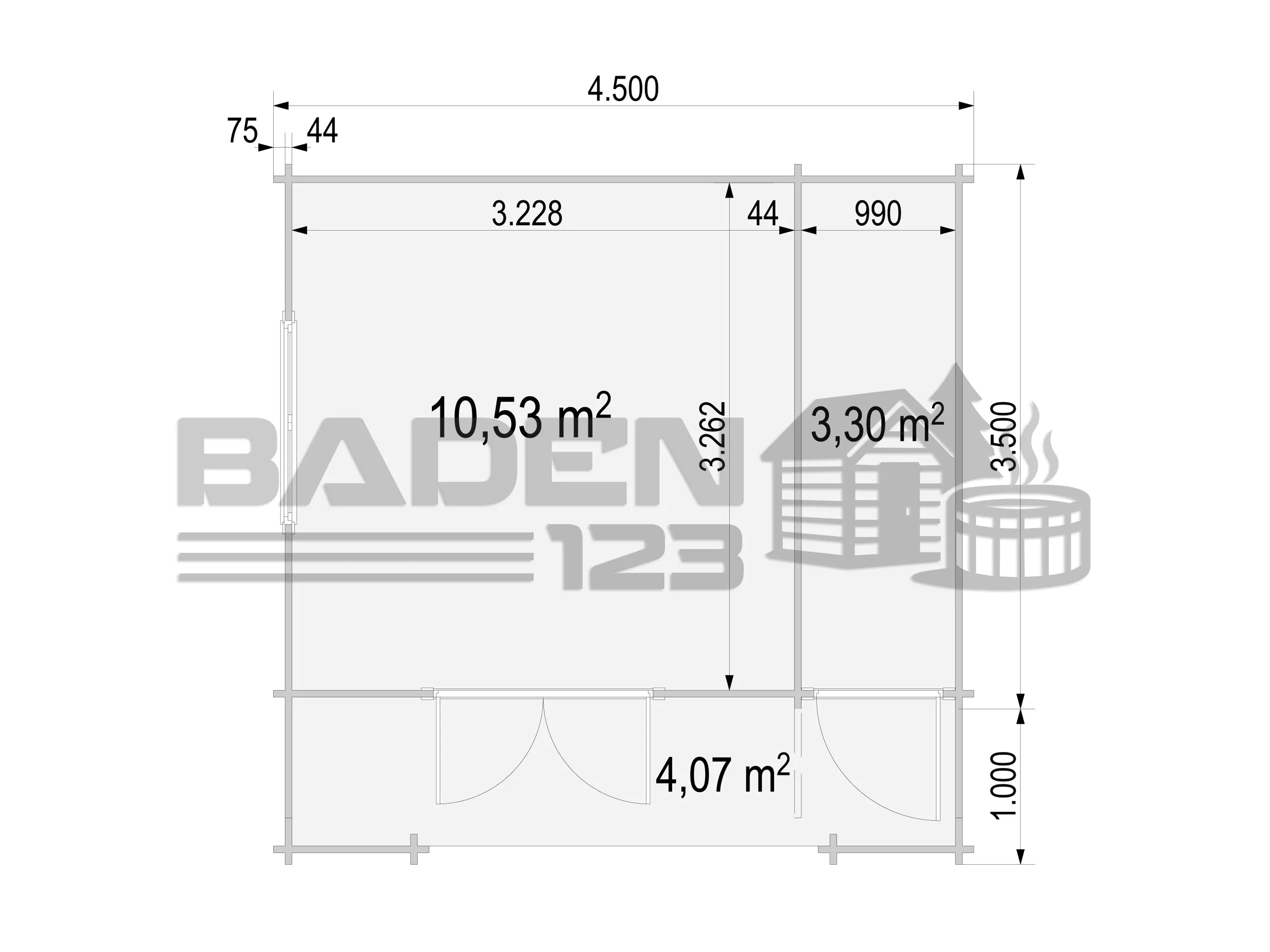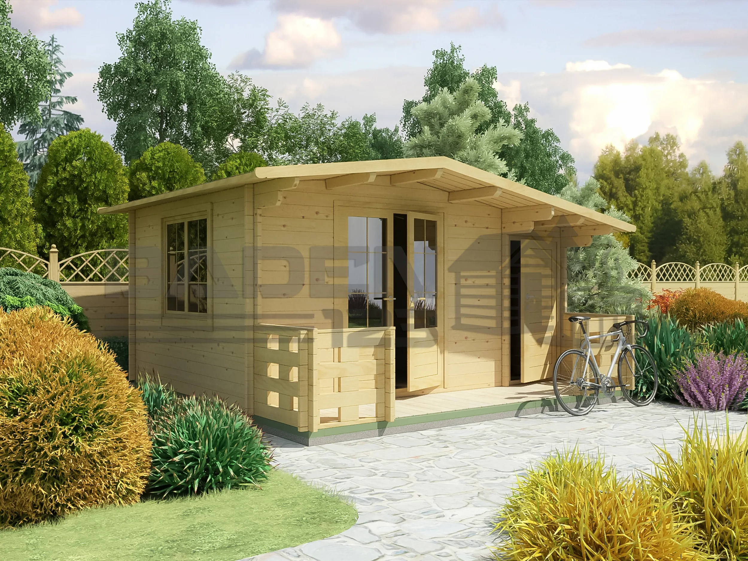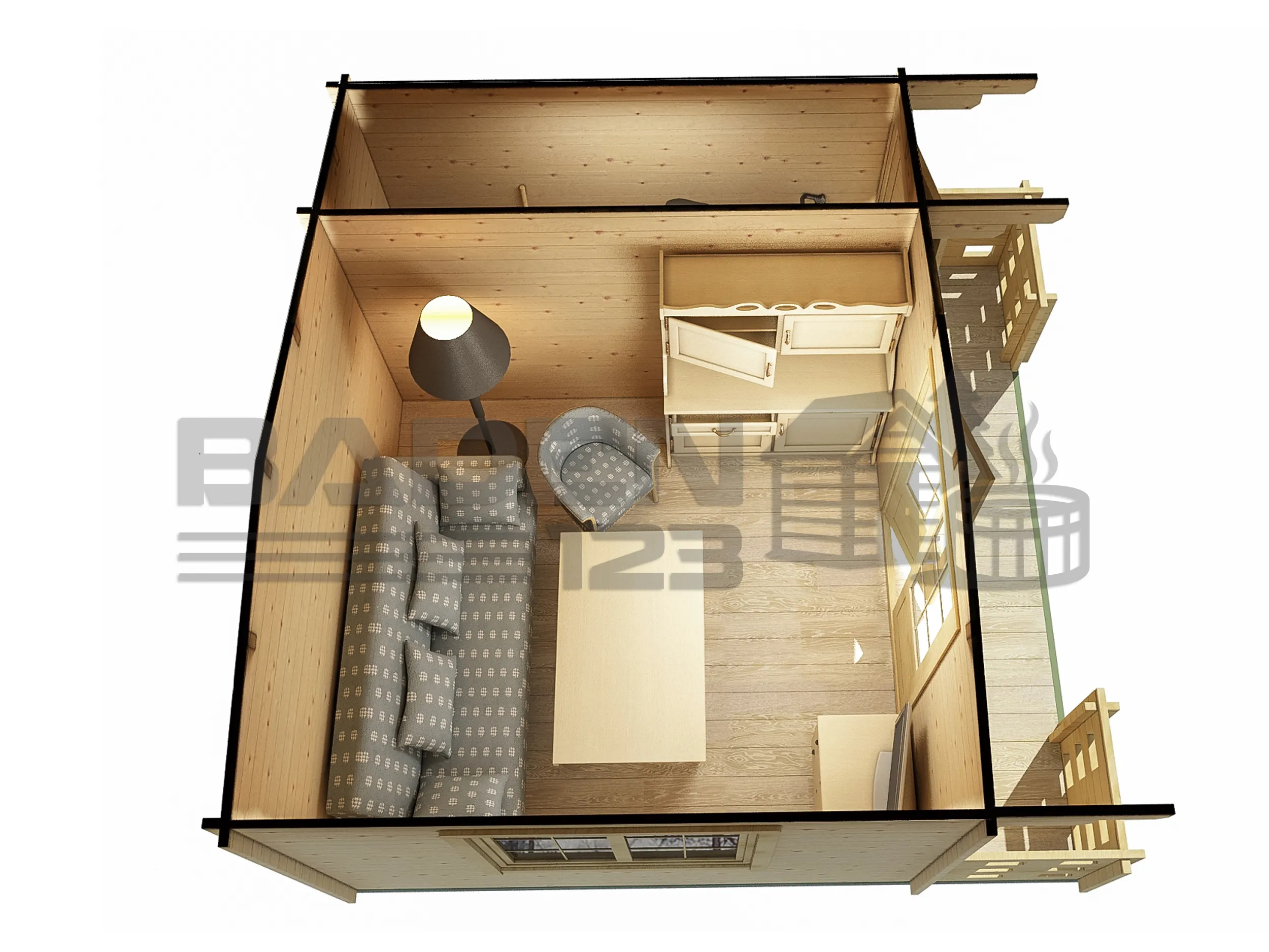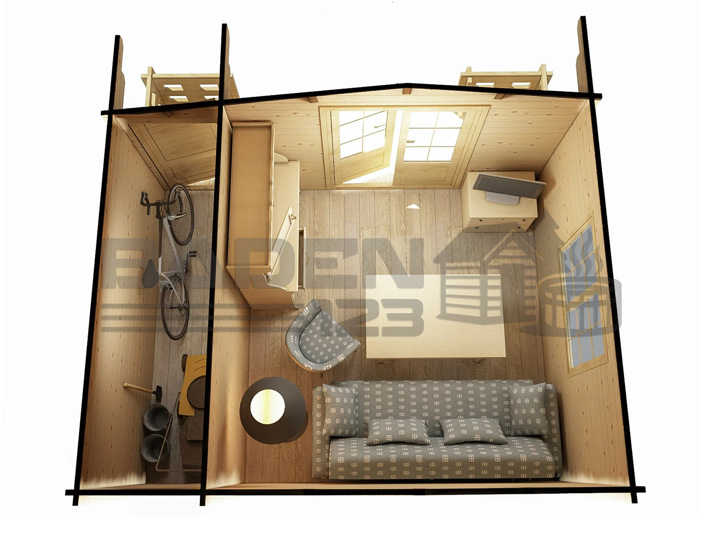 Dies ist eines der größten Häuser, die wir anbieten, und wir beschreiben es als eine gute Lösung für den praktischen Hausherrn. Unter einem Dach hat der Kunde nicht nur einen Raum, in dem er mit einem Nachbarn Basketballspiele anschauen kann, sondern auch eine Speisekammer mit Gartengeräten hinter der Wand. Das Haus besteht aus zwei Räumen – einem Wohnzimmer und einem kleinen Hauswirtschaftsraum – sowie einer Terrasse im Freien.