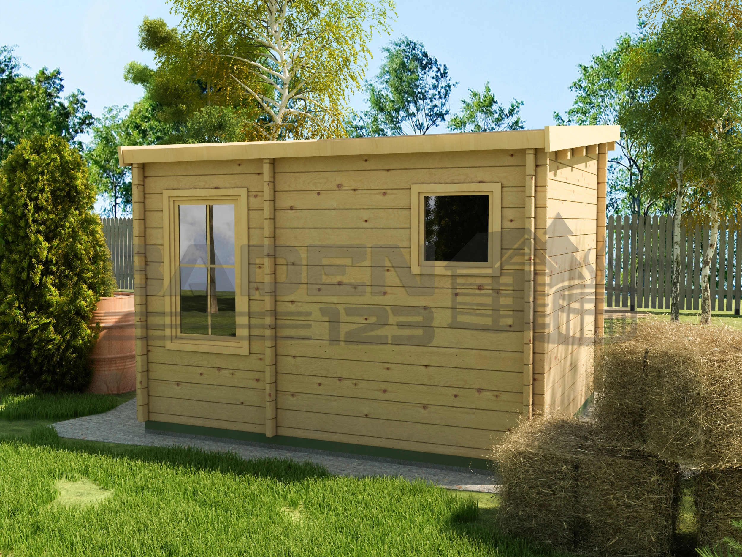 Dieses kompakte Gartenhaus aus Holz ist mit einer Glastür an der Vorderseite und zwei Fenstern an der Rückseite des Hauses erhältlich, einem größeren und einem kleineren. Diese Anzahl von Fenstern sorgt für eine sehr hohe Tageslichtdurchlässigkeit. Ein vielseitig einsetzbares Gartenhaus, in dem Sie wichtige Gartengeräte, Fahrräder und Kinderspielzeug bequem und ordentlich unterbringen können. Es ist auch ideal für Arbeitszwecke.