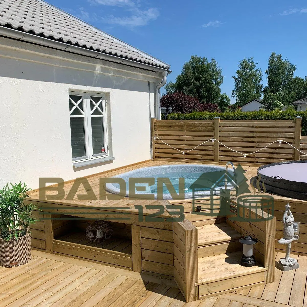 Dank seiner Einbaukonstruktion fügt sich der Zuber nahtlos in Ihre Terrasse ein und schafft ein elegantes sowie platzsparendes Wellness-Erlebnis im eigenen Garten.